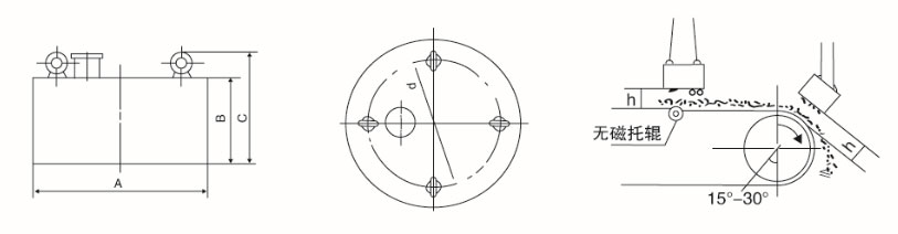 型號> 冷卻方式 適應(yīng)帶寬 mm 額定高度 mm 磁場強(qiáng)度 mT 勵磁功率 kw 適應(yīng)帶速 ≤m/s 外形尺寸mm φD×B 重量